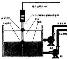 洗煤废水通过处理后,在洗煤废水池中进行澄清。为实现资源的重复利用,达到节能降耗的目的, 需要对煤泥和污水进行回收利用。煤泥比重大,沉降在水池底部,形成一个明显的分层界面,传统的洗煤废水煤泥分离完全依靠人工操作,通过目测和手动控制泵来实现水的循环使用和煤泥的回收,不仅劳动强度大,而且工人的工作效率低下,造成了极大的能源浪费。为了节约成本,提高洗煤废水处理效率, 降低工人的劳动强度,在洗煤废水池上采用双浮子磁致伸缩液位传感器来实现该环节的自动运行控制。