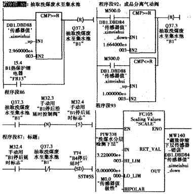 (2)成品分离。产品静置1h,实现煤泥与废水完全分离,在废水池的中部接有1条废水出料管道直通水洗锅,在PLC 中编写程序,比较传感器检测的液面和界面信号高度,可以实现自动回收煤泥废水的控制。当下浮子液面高于出料口或上浮子液面低于出料口时,都会自动关闭出水泵门。控制程序如图2所示。