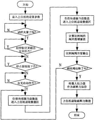 软件系统由PLC 控制软件、上位机数据监测软件两部分组成。 PLC 系统可根据拉力机机旁操作箱的手动操作信号完成夹具上紧、夹具打开、拉伸、拉力机急停等控制功能,同时,PLC 将位移传感器、油压传感器、 负荷传感器等信号进行实时处理,完成拉伸速率控制、拉伸过程限位保护、钢丝绳拉断的判断等工作过程。 上位机监测软件用VB6.0开发,通过 MPI 适配器与 PLC 的 MPI 口连接,完成 PC 与 PLC 的数据交换。 PLC程序流程图如下图所示。