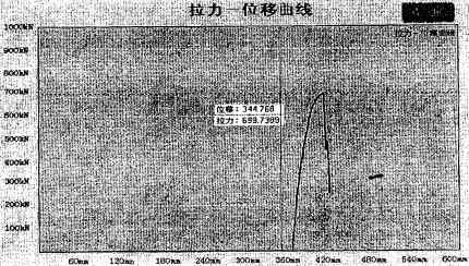 在试验开始前,在上位机的参数设置画面输入钢丝绳直径、规格、拉伸速度、最小破断力等试验参数后, 进入到试验主画面等待拉伸过程开始。在操作箱上由试验人员按下拉伸按钮后,上位机自动对拉伸过程进行记录并自动生成“位移一拉力曲线”、“位移一时间曲线”、“拉力一时间曲线”,同时在画面中实时显示当前主液压缸活塞杆位移、负荷传感器、油压传感器等参数。当钢丝绳被拉断后,可对试验数据进行打印、保存至数据库、历史数据回放。为便于对试样进行品质分析,还可以任意选择曲线的的某一部分进行放大、缩小显示。图5为一次拉断力试验结束后计算机绘制的“拉力一位移”曲线。