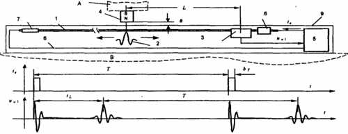 (1-波导钢丝;2-磁致旋转波;3-波检测器;4-位置磁铁;5-电子信号和处理系统;6-波反射器;7-减波元件;8-回线;9-传感器壳体)