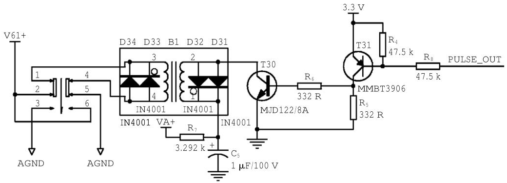 MS1022输出的PLUSE_OUT信号经过三极管驱动后输入到变压器B1中,形成高压激励信号,峰峰值可以达到50V,满足本系统工作要求。