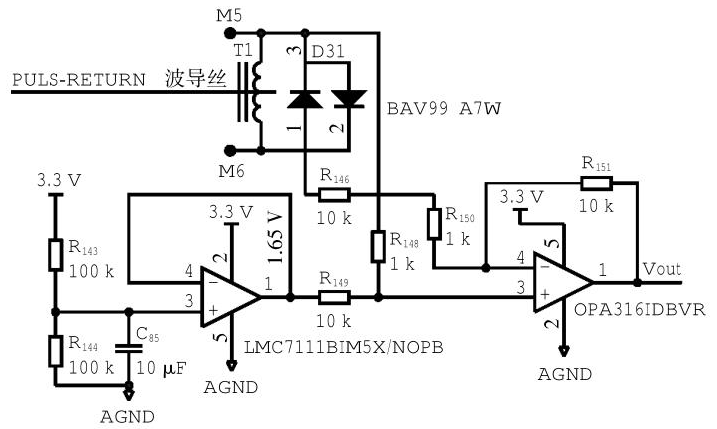 由于回波信号幅值仅仅几个毫伏,并且夹杂着大量杂波信号,需要在进入MS1022芯片前进行处理。因此设计回波检测电路对信号进行滤波和放大,以供MS1022芯片接收。如图4所示,运算放大器LMC7111BIM5X/NOPB的作用是抬高电路静态工作点,避免地线上的杂波干扰,运算放大器OPA316IDBVR的作用将信号放大。Vout信号进入到MS1022芯片,用来计算回波时刻。