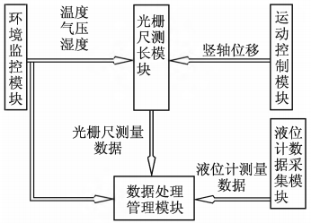 检测工作通过控制与数据分析处理软件进行,软件主要包括光栅尺测长模块、液位计数据采集模块、环境监控模块、直线运动控制模块、数据管理模块等。