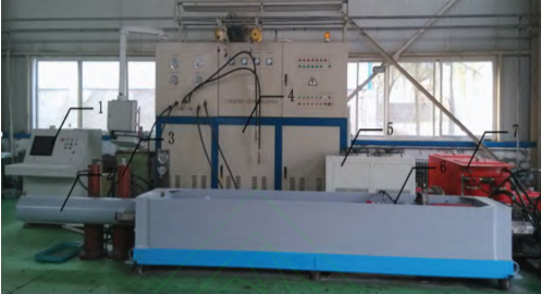 1. 控制台;2. 加载缸;3. 增压缸;4. 油液加载系统;5. 冷却器;6. 煤炭缸;7. 乳化液油箱