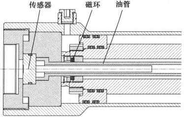 本研究的特种液压缸内置磁致伸缩位移传感器(文中简称为位移传感器)结构形式如下图所示,与常用液压缸的内置位移传感器结构不同,位移传感器与磁环中间存在用于通油的金属管路(文中简称为油管)。