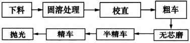 目前该液压缸油管材料为钢管1Cr18Ni9Ti,为 弱磁性奥氏体不锈钢,加工前经检测不导磁。经检测,该液压缸油管可被磁环吸附,故油管本身具有一定的铁磁性,油管的加工工艺流程如下图所示。加工方法中, 粗削会有较大的进给量,无芯磨会挤压油管表面,加工过程中油管表面组织结构会向马氏体金相组织转化,冷加工变形度越大,马氏体转化越多,钢的铁磁性也越大,被永磁体吸附能力越大。