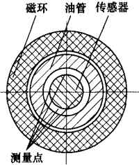 为近一步验证油管对磁环磁感应强度的影响,现对磁环通过油管传至位移传感器的磁感应强度进行试验研究,测量工具为特斯拉计单位mT, 最小精度0.1 mT。下图为磁环、油管、位移传感器的截面示意图,测量点为位移传感器圆柱表面面4处均匀分布。