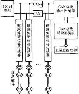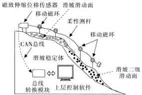 分布式磁致伸缩多点位移监测装置由磁致伸缩位移传感器、CAN总线转换器、上层控制软件、电源控制系统4部分组成。分布式磁致伸缩多点位移监测装置利用磁致伸缩位移传感器实现滑动面地表多点位移监测,以磁致伸缩位移传感器柔性测杆上的磁环感知滑坡多级滑动体的蠕变,测得的位置传感信号通过CAN总线传输到计算机上的上层控制软件,通过控制软件数据解析与处理,计算出滑动位移量与位移速度,根据位移监测数据实现滑坡裂缝位移实时监测与预警。监测装置原理如下图所示