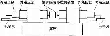 改造后压力机结构如下图所示,控制系统由PLC、触摸屏、磁致伸缩位移传感器组成,提高了系统的自动化程度及可靠性。压力机动力系统由以前的单筒液压缸改为双筒液压缸,双筒液压缸的内、外液压缸,分别由不同的电磁阀对其进行控制。内液压缸实际上是利用外液压缸的活塞作为缸壁,外液压缸运动会带动内液压缸运动。磁致伸缩位移传感器固定在内液压缸活塞内部的轴承座底部的监测装置上,与内、外液压缸同步运动,把测量结果通过PLC的模拟量输入模块(选用三菱公司的FX2N-2AD-BD模块)传送到PLC(选用三菱公司的FX2N-16MR)的内部,经过一系列内部运算,控制压力机两端内、外液压缸的行进距离,达到控制轴承座压入深度的目的。