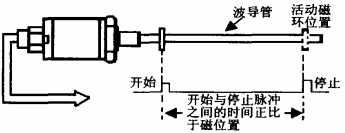 磁致伸缩位移传感器是利用Fe或Ni在磁场作用下具有伸缩能力的特性而设计的线性位移传感器。它由活动磁环和具有磁致伸缩性的波导管组成,活动磁环与波导管之间没有直接接触,它利用活动磁环产生的磁场与波导管内固定频率的电流产生的磁场相交,产生应变脉冲,该脉冲以固定速度运行到电子部件的测量头,从电流脉冲的上升沿到感应脉冲的上升沿之间的时间乘以这个固定速度,就是该活动磁环的准确位置。其结构如下图所示。