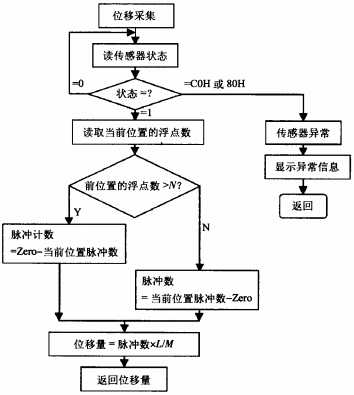 在完成好上面两项工作的基础上,就可以进行位移量采集程序的设计。位移量的采集有两项关键技术①正负方向的判断和正负脉冲数的计算;②位移量的计算。位移量采集程序图如下图所示。首先读取浮点位移量(用时,表明此时位移量为负,则此时的负向脉冲数零位脉冲数Zero减去当前位置的脉冲数;当Position小于等于N时,表明此时位移量为正,则此时的正向脉冲数等于当前位置的脉冲数减去零位脉冲数Zero。所测得的位移量单位是mm。