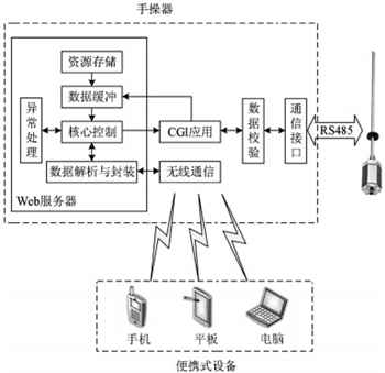 手操器需要具备远程操作以及良好的人机交互功能,以便于对应用于工业现场的磁致伸缩位移传感器进行快速调试,因此采用B/S架构并结合Web技术以提供更加简便高效的操作方式,整体方案如下图所示。手操器采用RS485接口与磁致伸缩位移传感器进行通信,其内部运行Web服务器,用于接收来自便携式设备的前端请求并通过CGI(Common Gateway Interface)和HTML实现请求响应和数据可视化。其中,Web前端所需的资源文件均存储于本地,在用户首次访问后统一上传。通过Wi-Fi模块将手操器拓展为无线网络接入点,使用户接入该网络后即可通过浏览器完成磁致伸缩位移传感器的现场调试。