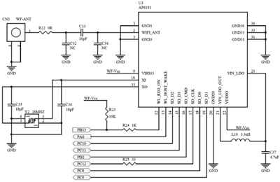手操器以ARM芯片为核心,硬件按功能可划分为最小系统电路、RS485接口模块、存储拓展模块和无线通信模块等,如上图所示。ARM芯片的型号为STM32F429,主频180M,自带1M的FLASH和256K的SRAM,具有SD、SPI、USART等多种外设接口。由于片内存储器大小无法满足系统需求,分别拓展了128M的NORFLASH用于存储Web资源文件以及32M的SDRAM充当发送与接收缓冲区。无线通信模块选用型号为AP6181的Wi-Fi模块,符合IEEE802.11b/g/n标准,启动后以AP模式工作,负责手操器与便携式设备之间的无线数据传输,该模块的外围电路设计如下图所示。RS485接口则作为手操器的外部接口,负责与磁致伸缩位移传感器进行通信。