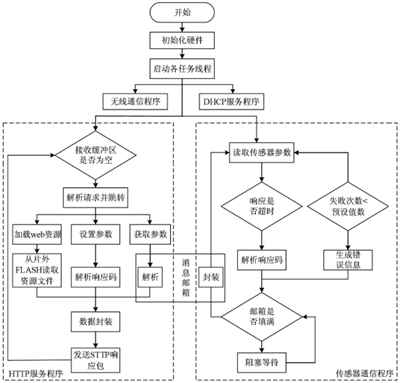 主程序负责完成硬件初始化和任务创建,待所有任务进入就绪状态后,开启抢占式任务调度,此时程序的执行逻辑由操作系统根据各任务的优先级和阻塞状态决定。DHCP服务程序为每个接入无线网络的便携式设备分配临时的IP地址。HTTP服务程序阻塞监听本机IP地址上的80端口,判断是否有HTTP请求到达,根据协议规范解析请求并执行URL对应的CGI程序,然后按协议格式封装消息并返回。传感器通信线程负责按Mod-bus-RTU标准协议与传感器进行数据交换,根据响应码解析数据并生成相应信息。无线通信程序负责控制无线通信模块的底层数据发送和接收,通过消息邮箱与LWIP协议栈进行网络数据包传递。