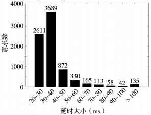 将电脑接入手操器的无线网络中并通过Chrome浏览器记录Web前端与手操器通信时所产生的HTTP报文,然后根据其生成的HAR文件分析Web应用性能并统计通信的延时情况。在一段时间内对手操器进行连续测试,测试条件为手操器以每秒20次的频率采集传感器的位移值并进行存储,然后由Web前端以0.5s为间隔定时向手操器发送请求以获取位移数据,延时大小以从浏览器发出请求到接收响应包之间的时间差为准。测试结果如下:测试期间,Web前端共发送8119次HTTP请求,成功返回8015个响应包,丢包率约为1.3%,平均延时约为37.6ms,具体情况如下图所示。由此可见,该手操器在测试期间运行较为稳定,延时大小可满足现场调试的需求。