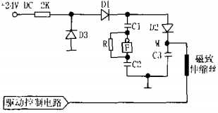 为了使磁致伸缩丝充分发挥作用,必须保证它瞬间的脉冲电流足够大。该液位计若使用在油罐计量中,要求应为本安型防爆,故在电源输出端串人安全栅,用标准24V工业电源,经过安全栅(内含2002左右的电阻)和电缆线,到液位计控制板上的电压只有20V左右。所以要保证丝上有足够强的电流,就必须使丝两端的电压升高,增加丝的长度时更是如此。故我们专门设计了一个用电容来瞬时升压的电路(见图1),以便能够正确可靠地检测到信号。因防爆需要,在电源正(±24VDC)和地之间加了2K的限流电阻、本电路利用反向器F、R、C2构成方波震荡器,使M点电压达到48V,再用单片机去控制丝上电流通断,从而使磁致伸缩丝获得较大的驱动电流。