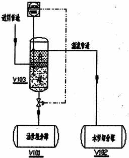 从图中可以看出,这是一个连续化的生产过程。进料管中的介质是氯乙酸甲酯、水与甲醇的混合物,物料连续地从分离罐V103的中部进料口流入罐内,在罐内自然分层。上层的物料是水与甲醇组成的水性组分,下层的物料是以氯乙酸甲酯为主的油性组分,中间为混合层,工艺的要求是水性组分必须从溢流管道流出进入V102储罐;油性组分必须通过液位调节阀LV103进入V101储罐;同时为了防止物料过多,从分离罐顶部溢出,还需设置罐内高液位时的报警。