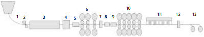 1—连铸机;2—摆剪;3—隧道加热炉;4—立辊轧机;5—粗除鳞机;6—粗轧机组;7—切头剪;8—感应加热器;9—精除鳞机;10—精轧机组;11—层流冷却装置;12—高速飞剪;13—卷取机