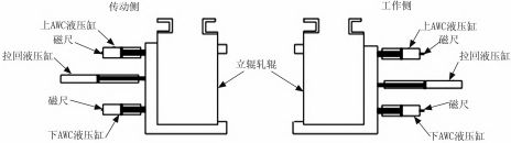 立辊轧机分为传动侧和工作侧,在传动侧和工作侧各有1根轧辊。立辊轧辊在垂直方向上由电动机带动旋转,水平方向上,单侧由3个液压缸驱动,如下图所示。从下图中可以看出,单侧上下各有1个由伺服阀控制的液压缸(AWC缸)和1个电磁阀控制的拉回液压缸。立辊的宽度调整由AWC缸实现,拉回缸在正常情况下始终施加一个远离中心方向的力,保证立辊机械结构与AWC缸紧密接触,消除问隙。每一个AWC缸都安装1根内置式磁致伸缩位移传感器,用于检测AWC缸的行程。