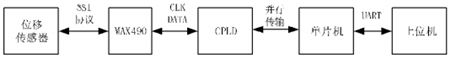 但通常具有SSI协议的传感器都没有现成匹配的数据读取设备,因此本文提出了利用CPLD和单片机来协同处理SSI数据,实现对SSI信号的读取。本文设计的SSI信号读取方案框图如图2.MTS位移传感器具有SSI信号输出端,SSI协议的CLK时钟信号和DATA数据信号为差分方式进行传输。