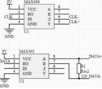 同步差分时钟信号与数据信号在位移传感器与CPLD之间是以差分形式传输的,而CPLD端口接受两者的信号为单端信号,所以需要应用差分平衡型收发合一芯片MAX490.将同步差分时钟信号CLK+、CLK-和同步差分数据信号DATA+、DATA-装换成单端信号,如图4所示是差分转单端的转换电路。