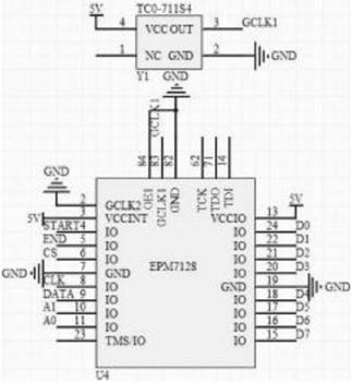 单端DATA信号由CPLD来采集,CPLD的功能有脉冲计数器、串行数据转并行数据寄存器、收发驱动器、输出控制等。如图5所示,所使用CPLD具有高阻抗、电可擦除等特点,可用门单元数2500个,宏单元数128个,输入输出线数84个,工作电压为5V。图中画出了部分所使用到的EPM7128管脚,未使用的已省略。TCO-711S4是由5V供电的有源晶体振荡器,相比无源晶振,可以给CPLD提供更加精确的GCLK1全局时钟信号,保证了逻辑时钟的准确度。CS为片选信号,由单片机给定选中CPLD工作就绪,START是脉冲时钟CLK开始信号,高电平时有效,END为所采集的25位数据并口转换结束完成状态指示,高电平是正在转换,低电平时转换完成,A1A0是地址译码,分别代表着四个8位数据的地址,由单片机控制地址译码来读取。脉冲时钟CLK是CPLD主时钟分频后得到250kHz的时钟脉冲后给传感器,脉冲时钟每发出一个时钟上升沿,传感器就会输出一个DATA数据。发送给传感器SSI通信时钟脉冲将25位数据DATA采集到并分批次转换成8位,缓存到内部定义的寄存器中,等待刷新和单片机的随时读取。CPLD中的脉冲时钟分频功能、串并转换功能、逻辑控制功能等在quartus中用Verilog描述这些硬件功能并调用Modelsim仿真结果,确定CPLD功能完好。