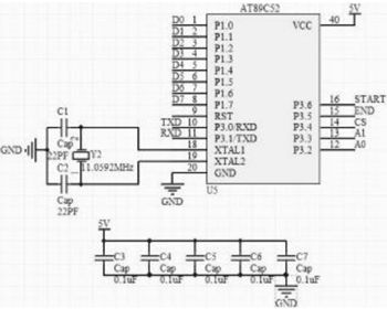 由单片机控制CPLD并行读取EPM7128相应寄存器中的数据,如图6所示是AT89C52并行读取CPLD寄存器中的数据电路图,单片机有5V供电,由五个0.1μF的非极性电容进行滤波,充当了电池的作用,使5V的电源更加稳定。单片机将P3.6口置高电平时,时钟脉冲CLK启动工作,P3.4口置CS为低电平时,CPLD开始采集转换数据,当END低电平时转换完成,P3.2和P3.3口控制A1A0地址,也就是CPLD中四个八位并行数据的地址,单片机每次读取八位数据,分四次将一帧数据读取完,A1A0地址为“11”时,单片机由DO~D7并口读取低八位数[];A1A0地址为“10”时,单片机读取次低八位数;A1A0地址为“01”时,单片机读取次高八位数;A1A0地址为“00”时,单片机读取次高八位数。