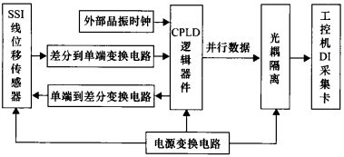 CPLD逻辑器件接收外部的晶振时钟信号将其分频,并经单端转差分电路后作为与SSI接口的线位移传感器同步时钟,SSI接口线位移传感器输出的差分数据信号经差分变单端数据变换电路后送入CPLD逻辑器件,同步时钟信号发送的个数由CPLD内部计数器计数,当计数器达到指定时钟个数后将数据并行输出锁存到数据输出线上,经光耦隔离后送入计算机的DI采集板卡输入端,从而实现了SSI接口数据到并行数据输出的转化。本方案设计的好处在于SSI接口到并行信号转化完全由CPLD器件编程实现,节省了控制系统的开销,同时输出的数据信号经过光耦隔离,增强了CPLD高速工作时的稳定性,避免数据由串行改为并行时受到干扰。