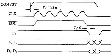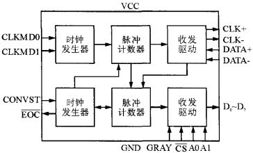一帧同步时钟脉冲信号,脉冲的个数由编码器的精度决定,同时转换结束管脚EOC变高。发送脉冲期间管脚EOC保持高电平状态,转换结束EOC管脚电平变低后,即可从Do~D₇并行读取编码器数据,每次读取八位,由A1、A0控制输出数据高低位,0表示读取最低八位、1表示读取最高八位,例如对于16位编码器只需读取两次(A1、A0分别为00、01),最多可以读取32位数据。编码器并行数据读取结束后将CONVST管脚置低,准备启动下一次转换。