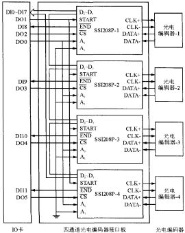 采用PCI-1716的输入端口DIO~DI7连接四片SSI208P的数据线Do-D,由于SSI208P在没有片选信号的情况下数据线是高阻态的,因此数据线可以共用。PCI-1716的输出端口DO1连接四片SSI208P的启动转换管脚START,可以同时控制四路SSI编码器。PCI-1716的输出端口DO0连接四片SSI208P的地址选择管脚A0.因编码器为16位,A₁接地。PCI-1716的四个输出DO2-DO5分别连接四片SSI208P的片选管脚CS。IO卡的四个输入DI9-DI11分别连接四片SSI208P的转换结束指示管脚/END。使用PCI-1716的18个IO口就可以实现四路光电编码器的时序控制和数据采集。