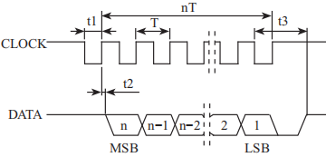 SS通信协议的双方,一方发送时钟信号,另一方在这个时钟脉冲信号的控制下从最高有效位(MSB)开始同步传输数据。SSI信号传输时序图如图1所示。其中D0~Dn为数据信号,T为一个时钟信号周期的持续时间;Tm为单稳触发时间,Tp为数据传输间隔,并且Tp≥Tm;MSB为最高位,LSB为最低位。