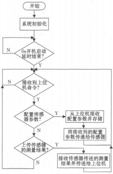 在SSI-USB转换器的软件设计部分,由于在上传传感器的测量结果的过程中要使用SPI通信代替SSI通信以实现高速传输的目的,因此要对SPI进行初始化,此外也要对I/0和USB进行初始化,即开机启动时要对系统进行初始化。初始化工作完成后就进入while循环,为了保证计算机已经完成对SSI-USB转换器的插入检测和枚举,利用定时器0设置6s开机启动延时,6s延时只在开机启动时执行一次。延时时间到之后,不断查询上位机是否发送命令,若接收到命令再判断是什么命令,然后去执行相应命令对应的服务程序。程序流程图如图4所示。