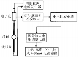 磁致伸缩位移传感器的电路原理框图如图1所示。在周期脉冲发生模块中,由晶振和计数器调节控制时钟频率,向波导丝发送激励电流脉冲信号;信号拾取模块中,检测线圈感知接收回波信号,噪声信号为共模信号,而扭转波信号为差模信号,因此经信号的滤波和差模放大后,进行零位或峰值检波,确定扭转弹性波信号从浮球处传到检测线圈的时间,以脉冲宽度反映扭转弹性波在波导丝中的传播时间;在每一个周期内对电压比较电路处理后的脉冲信号积分,经过过压保护电路和放大电路后调整到合适的输出电压,将位置信息以符合HART协议的标准电流信号形式输出。