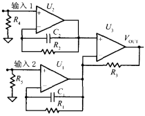 扭转弹性波信号的检测拾取、滤波是设计传感器回波接收模块的关键技术,因此回波信号的耦合和滤波放大电路显得尤其重要,它决定了能否采集到稳定的回波信号。由于线圈接收到的传感器振动、热噪声等干扰信号为共模信号,扭转波信号为差模信号,采用差模放大,提高共模抑制比的方法增强回波信号可信度。图3为回波差模放大电路,U₁和U₂对检测到的信号滤波放大后,由U₃对这两个信号差模放大,为后续的处理电路得到了较好的信号