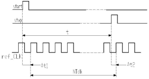 FPGA在产生起始脉冲信号Start的同时启动时间测量模块开始计时,传感信号经过信号调理之后的整形脉冲信号为Stop,输入到FPGA的IO口中被FPGA捕获到时停止时钟计数。被测时间t由3个部分组成:1)脉冲计数法得到的参考时钟整数倍部分NT;2)Start信号上升沿与紧接着的参考时钟上升沿之间的时间间隔△;3)Stop信号上升沿与紧接着的参考时钟上升沿之间的时间间隔△t₂。则有: