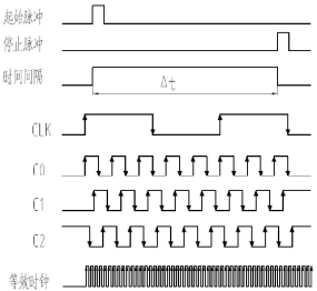式中T为相移时钟计数法的等效时钟周期,fm为相移时钟计数法的等效计数频率。采用新的方法等效于将计数频率提高为原来的2m倍,相应的测量误差减小为原来的以3路时钟为例,输入时钟CLK经过FPGA的锁相环PLL倍频并移相之后,得到同频的3路时钟信号即C0、C1和C2,其相位依次相差120°,通过这3路时钟信号的上升沿和下降沿分别在相同的启动脉冲信号下开始计数,并在相同的停止脉冲信号下停止计数,磁致伸缩位移传感器计数原理如上图所示。