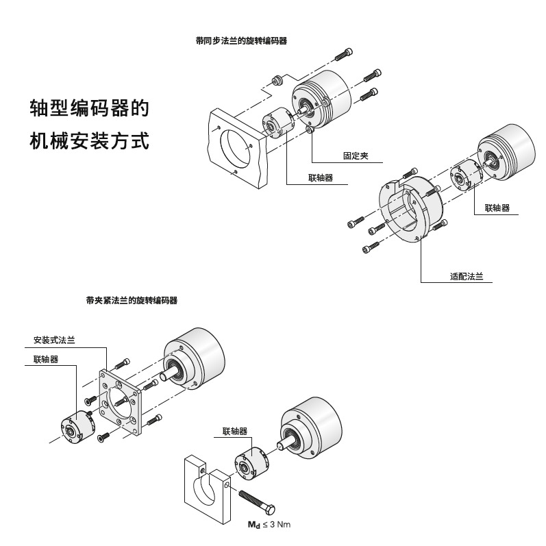 1.1.4必须保证所有连接紧固牢靠。装好后要将各个螺栓检查一遍,确认无松动。(编码器常见的几种安装形式见下图)