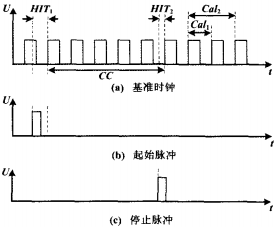 图2中:HIT和HIT₂为TDC-GP2在相应区域间内测得的通过的门电路个数,并记录在内部寄存器中;CC为基准时钟在相应区间内测量而得到的时间。在测量过程中,必须对TDC-GP2进行内部校准,即记录在一个和两个基准时钟周期内通过的门电路个数,用Cal₁和Cal₂来表示。