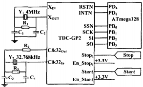 图3中,4MHz晶振作为TDC-GP2的基准时钟和芯片的粗计数器;32.768kHz晶振作为TDC-GP2的校准时钟。测量前必须对基准时钟进行校准。TDC-GP2从校准时钟引出Start和Stop脉冲,启动TDC-GP2单元测量时差,结果存储在结果寄存器中,并对中断标志位置位。微处理器可以计算出基准时钟的频率误差。