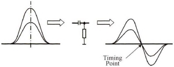 故本研究采用过零时刻鉴别又称高通容阻时刻鉴别法,如上图所示。将接收信号通过一高通容阻滤波器,使待测信号的极值点转变为零点,双极性输出信号的过零点即为时刻鉴别的起止时刻点,然后通过过零比较电路来判别出返回脉冲信号的起止时刻点,这种方法对输入信号的幅度变化不敏感,只要求接收通道工作在严格的线性方式,信号不失真。