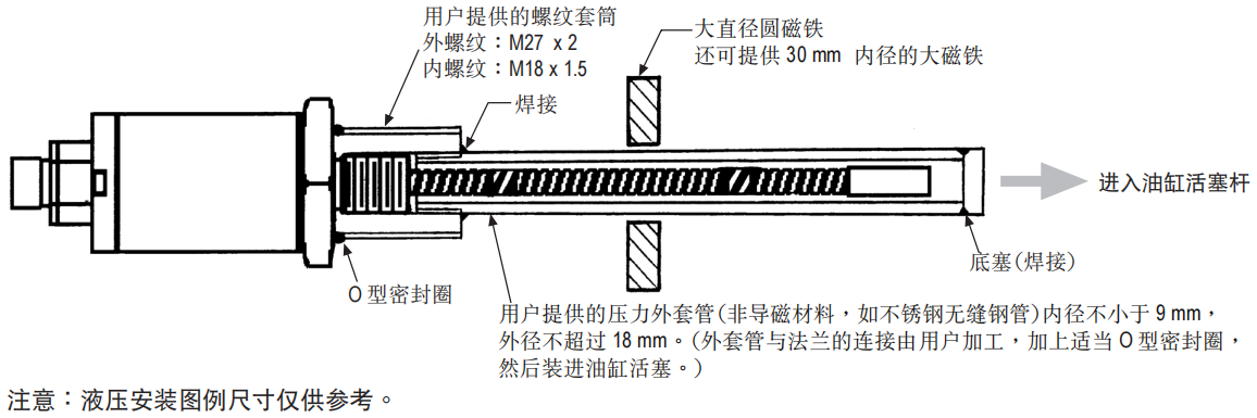 当应用于液压缸的直接行程测量时,传感器的耐压不锈钢圆管必须按图示完全装入活塞杆的钻孔内。意思是在活塞杆完全伸出时圆管尾端还保留在活塞杆孔内, 这样能保证长寿命和无故障,操 作也不受液压油使用影响。